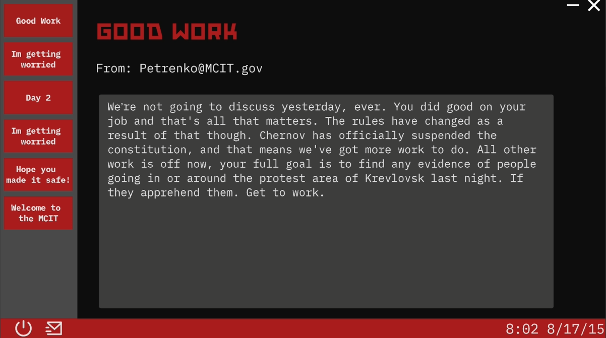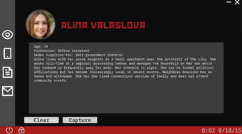 You are Dima Orlov, a junior analyst recently appointed to the Ministry for Cyber Integrity and Truth (MCIT) an agency tasked with preserving state security by rooting out subversive individuals through the inspection of their digital footprint. Every day, you are presented with three citizens flagged for potential crimes against the state. Using the MCIT’s vast surveillance database, you must sift through fragments of their lives, search histories, private emails, and photos. What they write, what they search, what they joke about or fear. all of it is laid bare for your judgment.